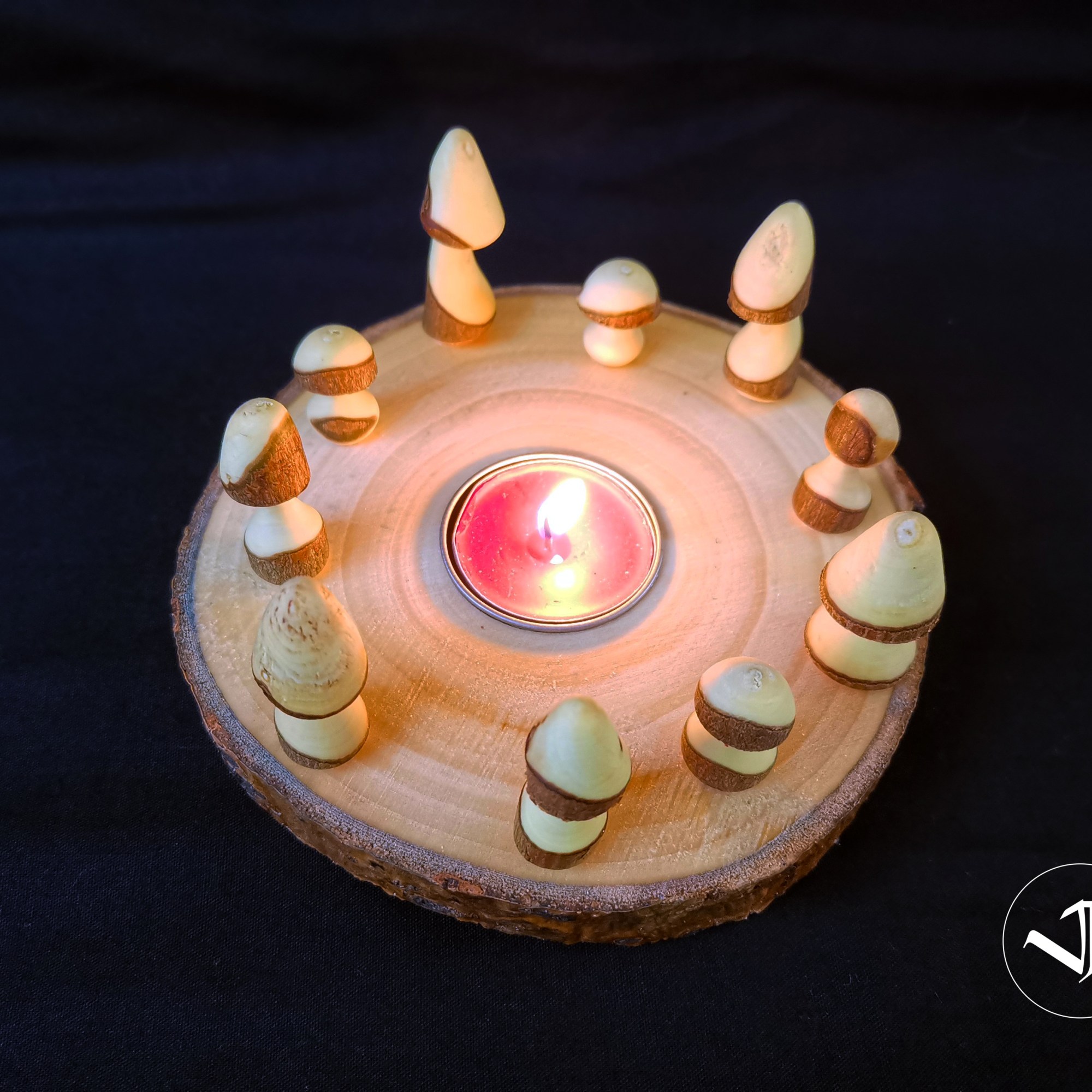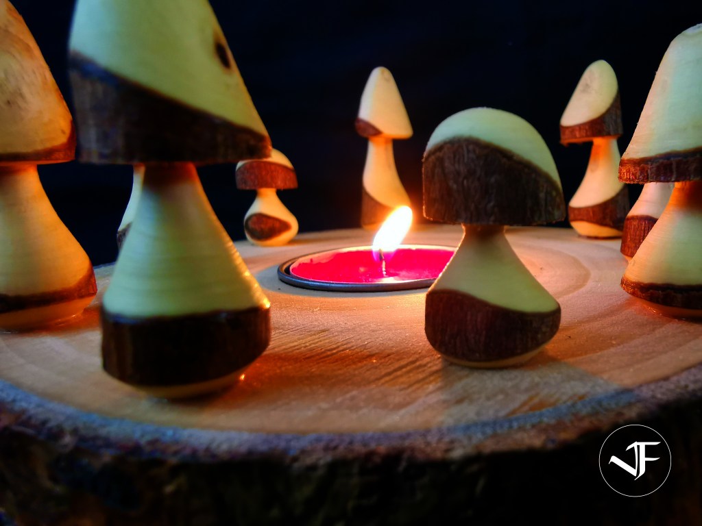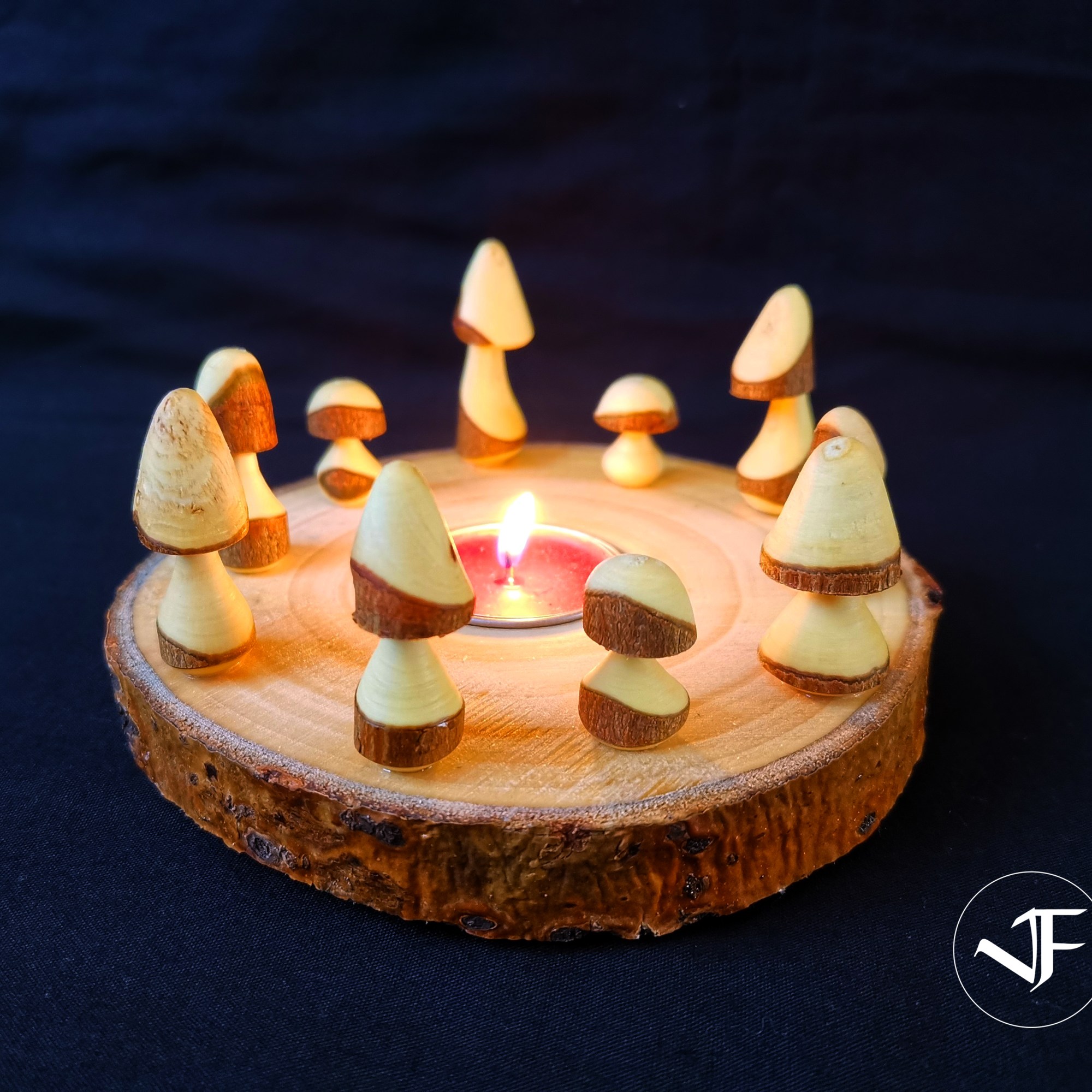 A beautiful log slice with a tealight insert surrounded by hand turned miniature mushrooms from a variety of woods.