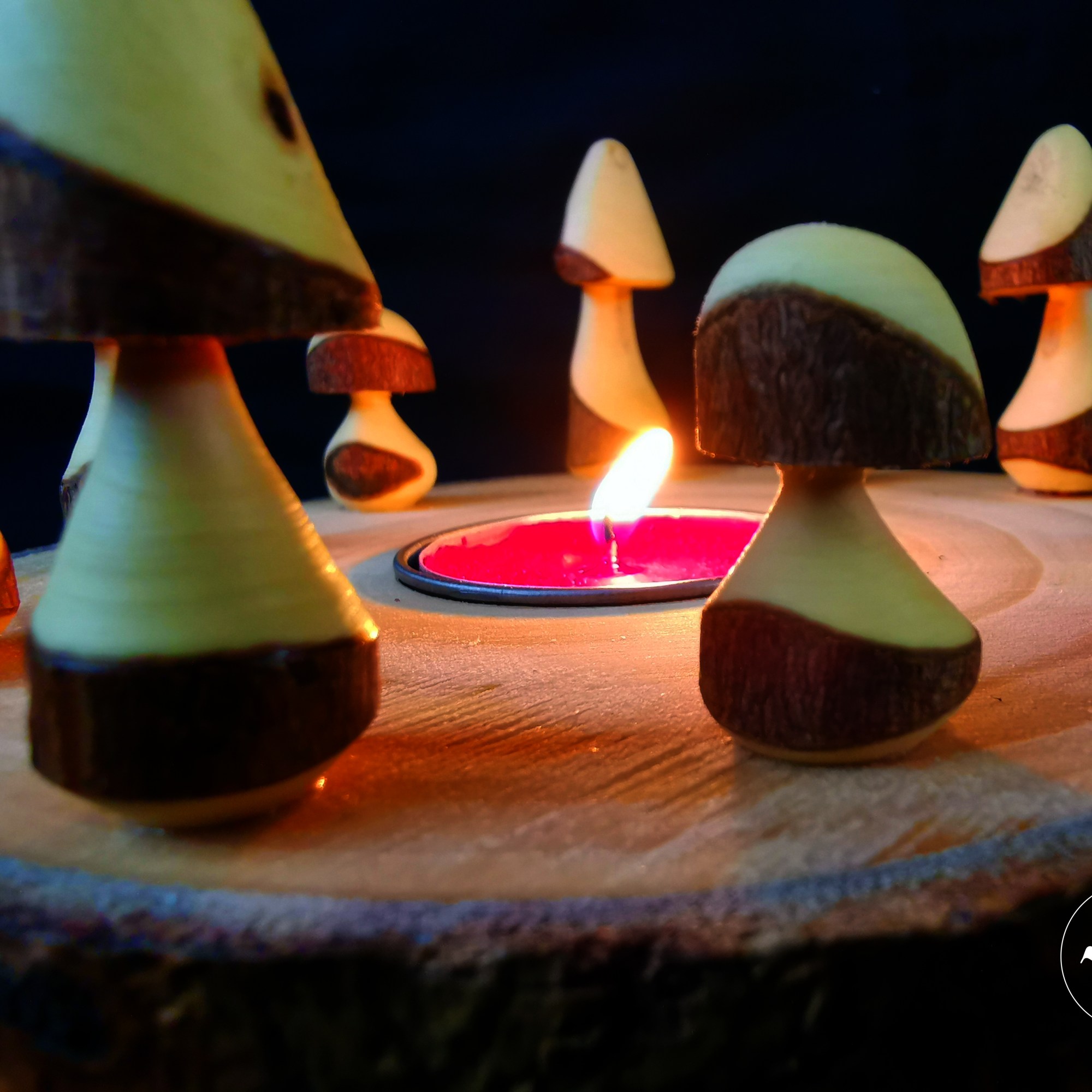 The log slice and mushrooms are coated with boiled linseed oil and when the light from the tealight shines on the mushrooms it causes a shimmer that sends a light and shadow display through the spaces between the mushrooms creating a calming affect!