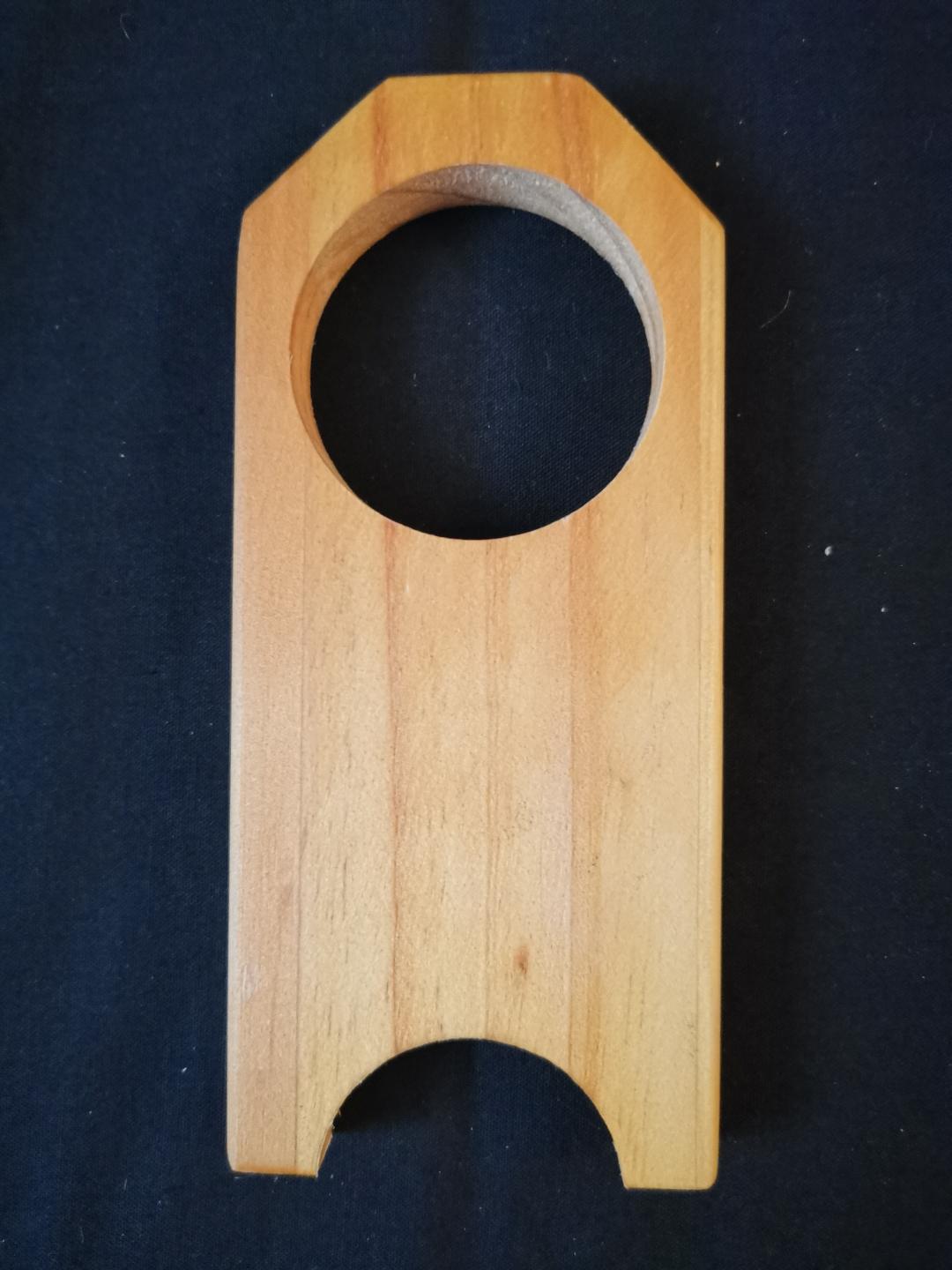 Features a hole near the top for the neck of the bottle to rest in, the base has a 45 degree angle cut so the weight of the bottle (and its contents) makes the bottle balance on the display stand.