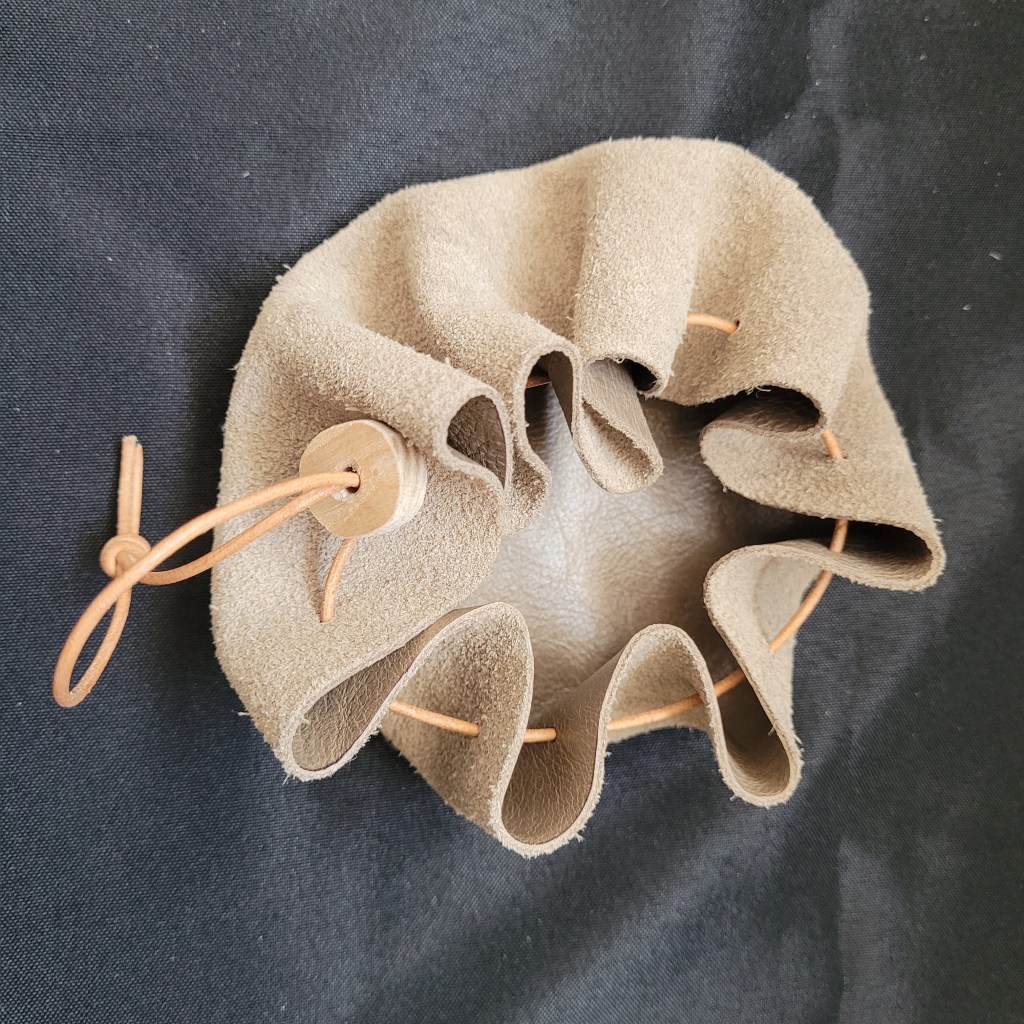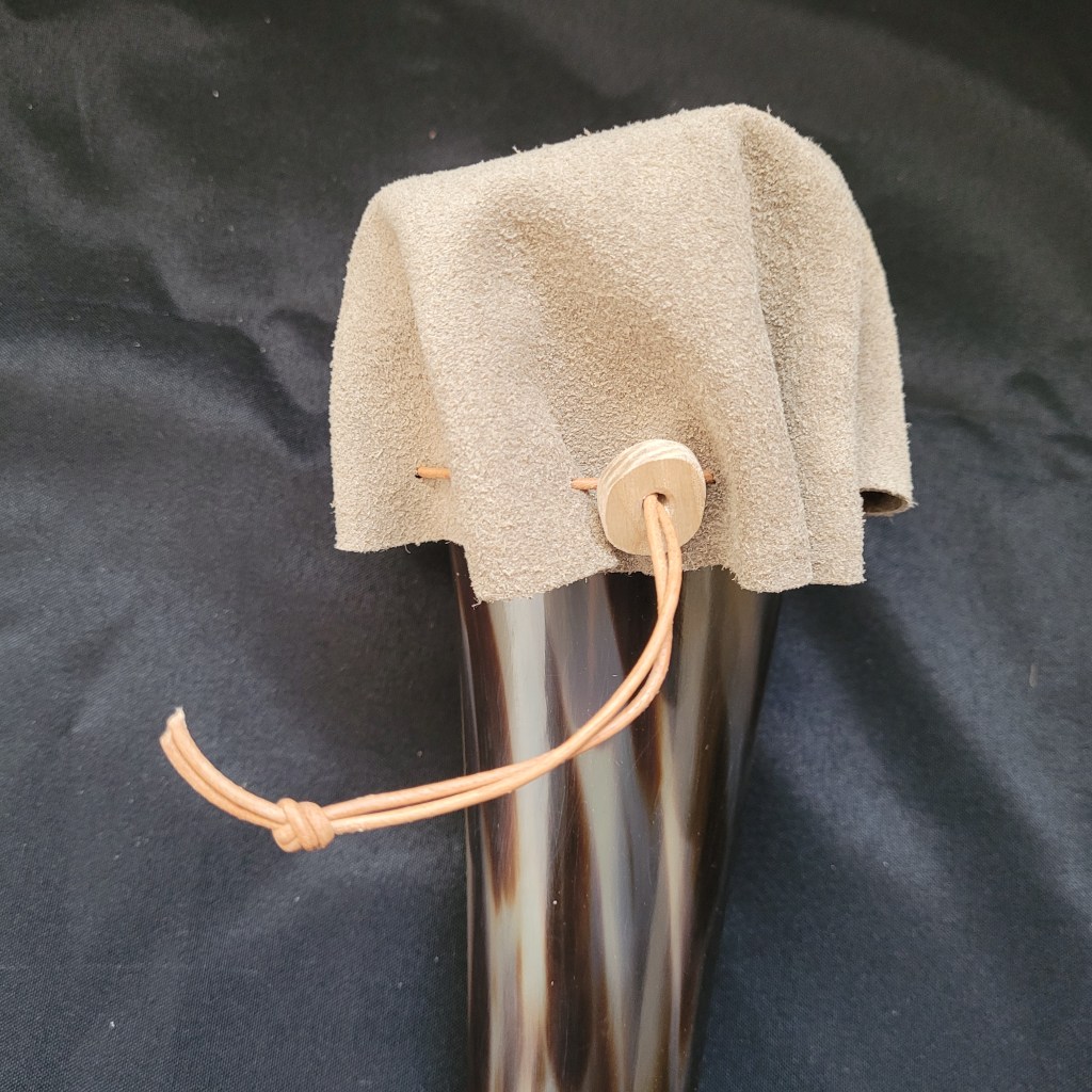 Each cover is produced using soft and flexible leather, easily closed around the top of the drinking horn using the leather thong and is held in place with a small Ash ‘grommet’.