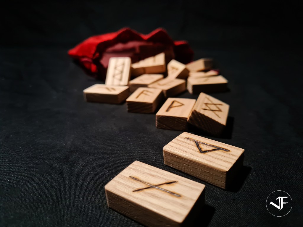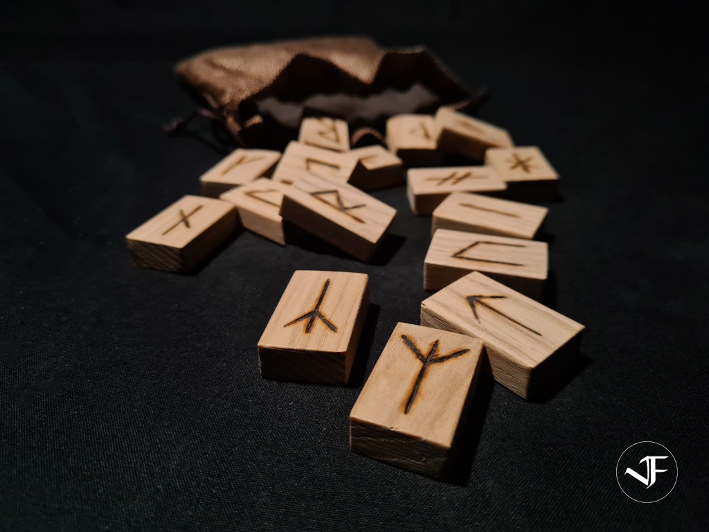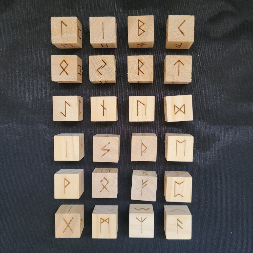 These are hand cut from solid Ash wood, sanded and inscribed with the rune symbols. We have either elder or younger futhark rune sets available.