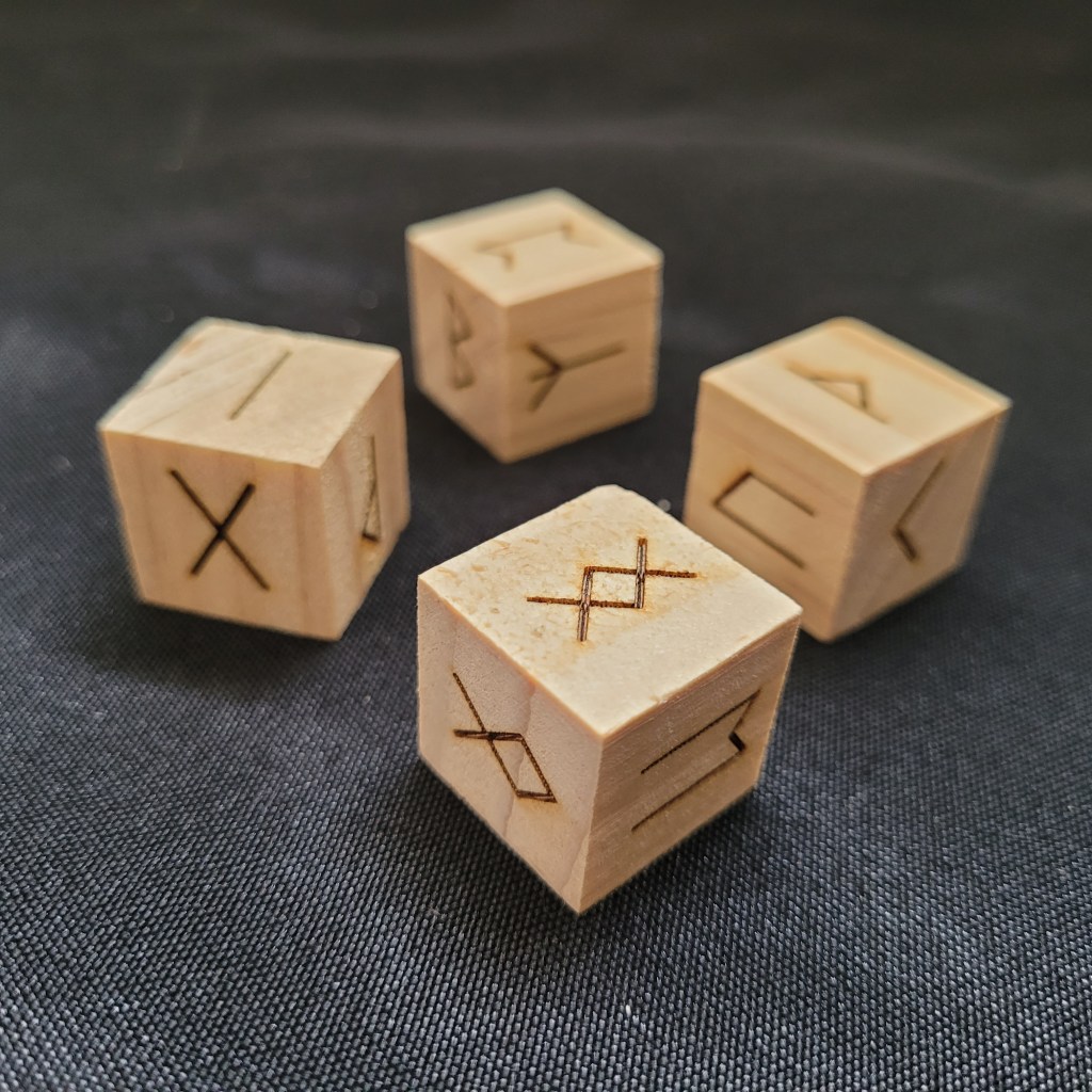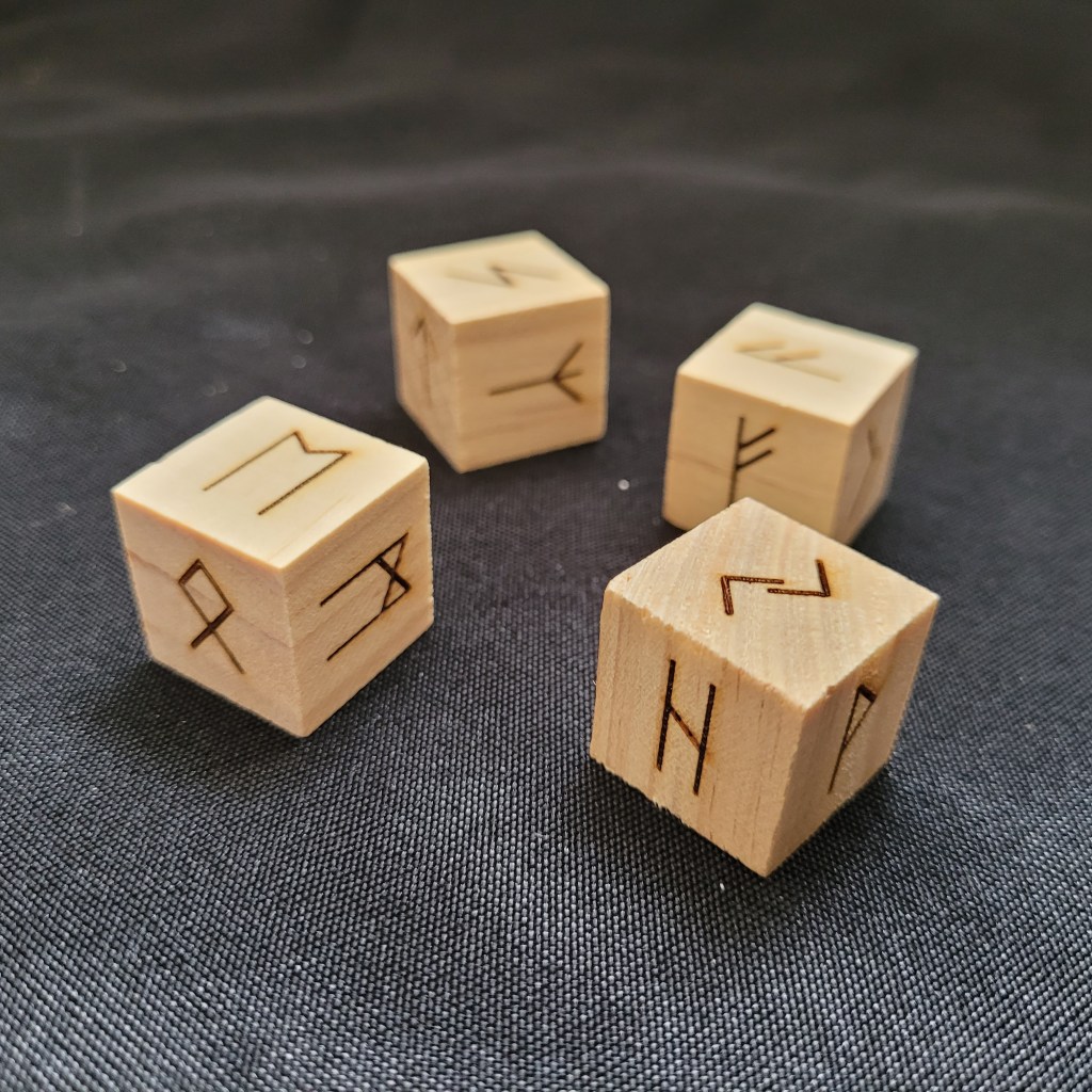 A set of four dice with the complete set of Elder Futhark Runes engraved onto them, all contained within a drawstring bag for ease of transport and keeping them safe.
