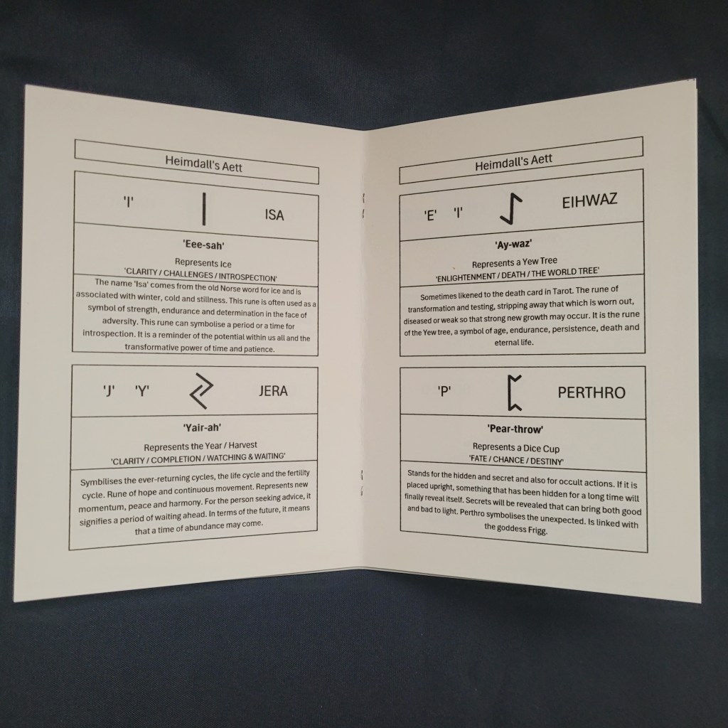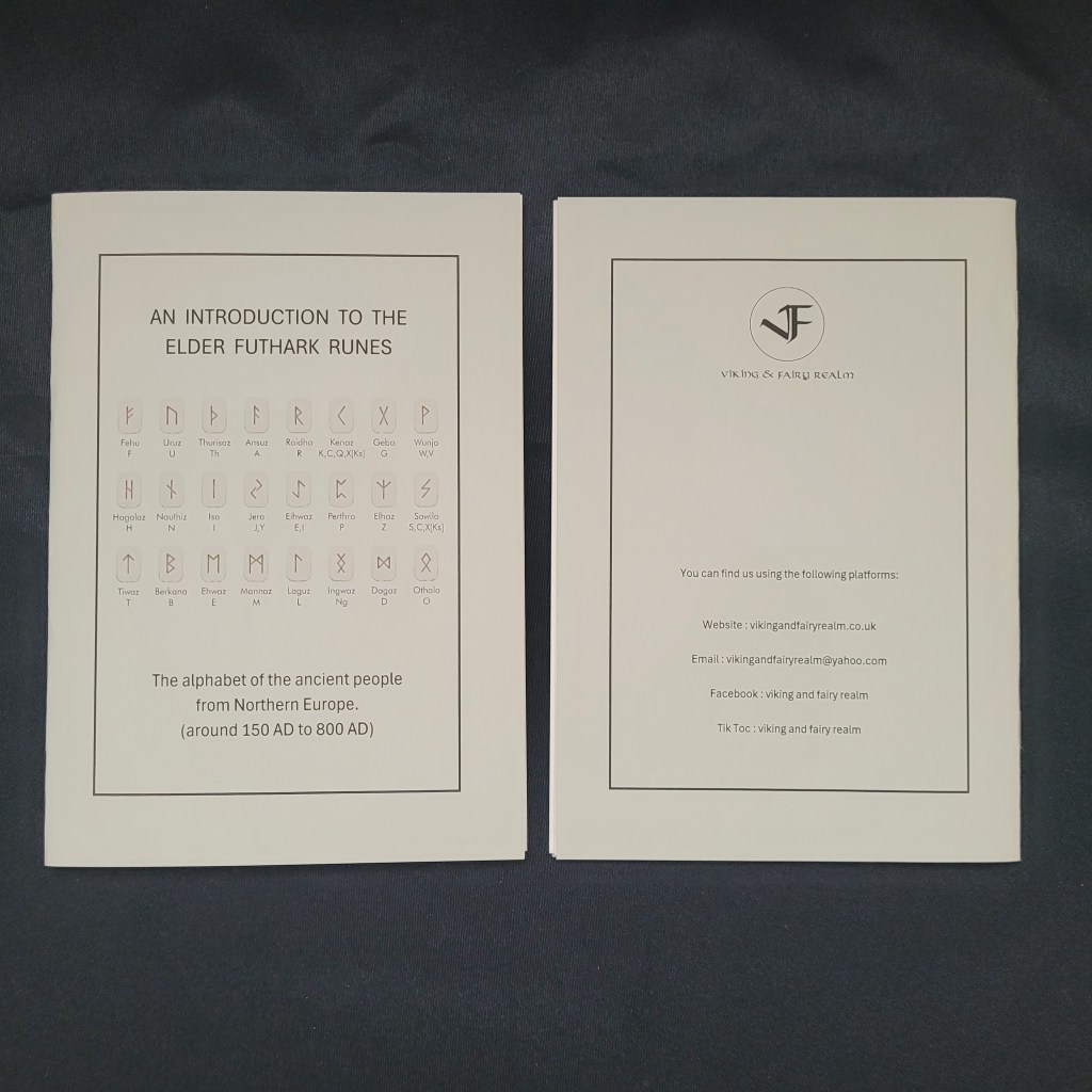 The booklet contains information regarding each rune, the letter it represents, how to pronounce the rune name, what the rune represents, basic meanings and its symbolism within the Norse world.