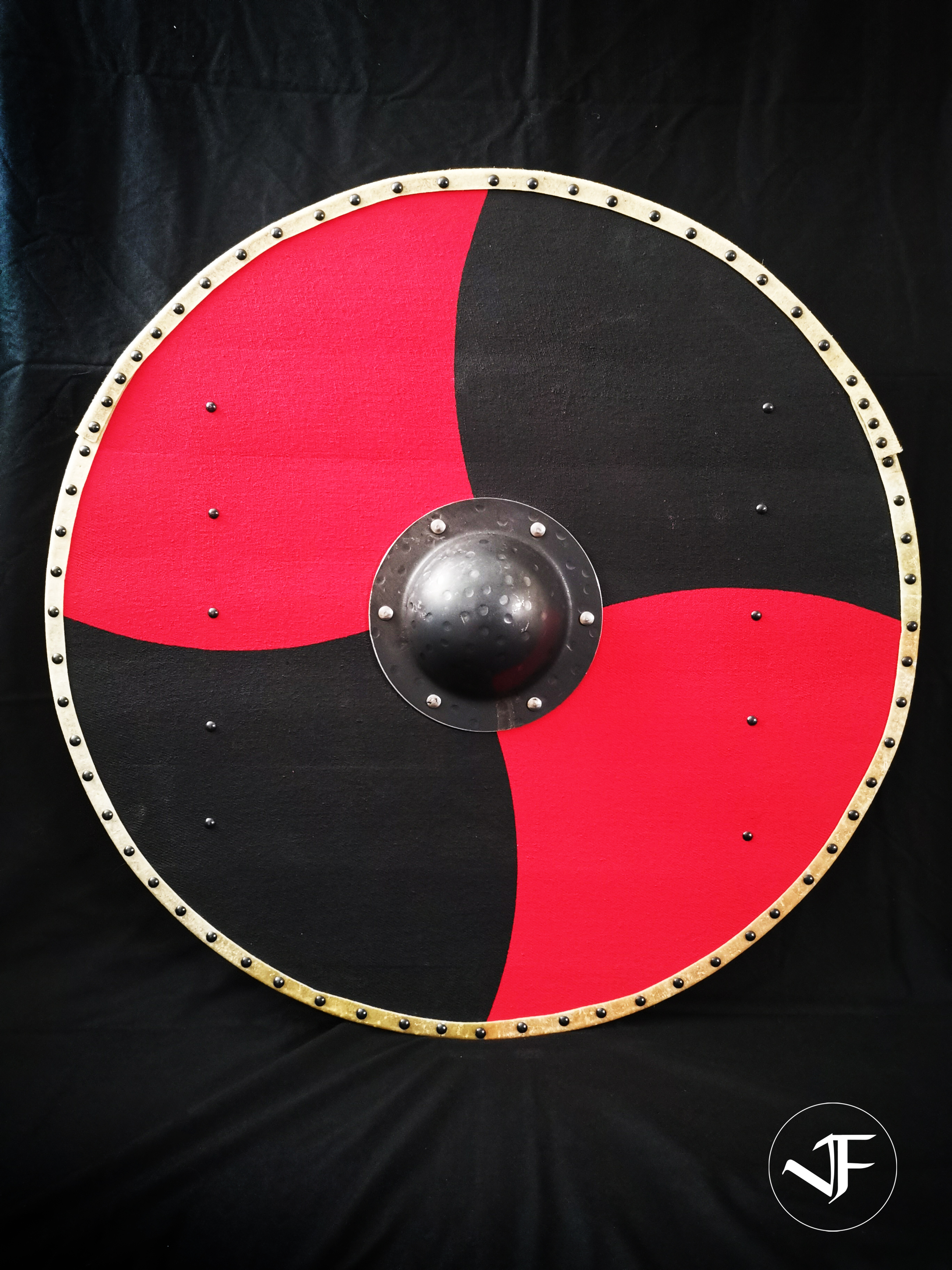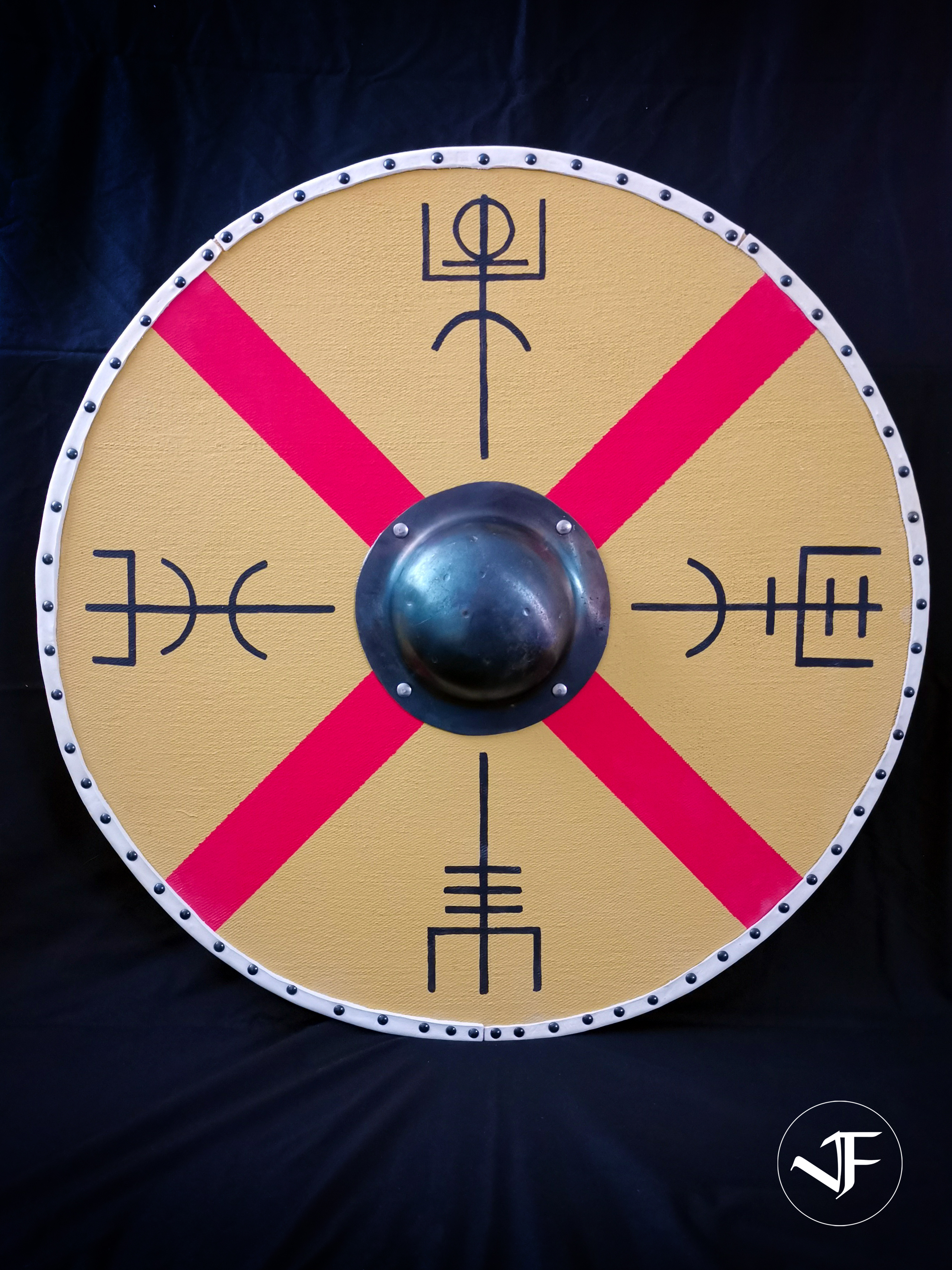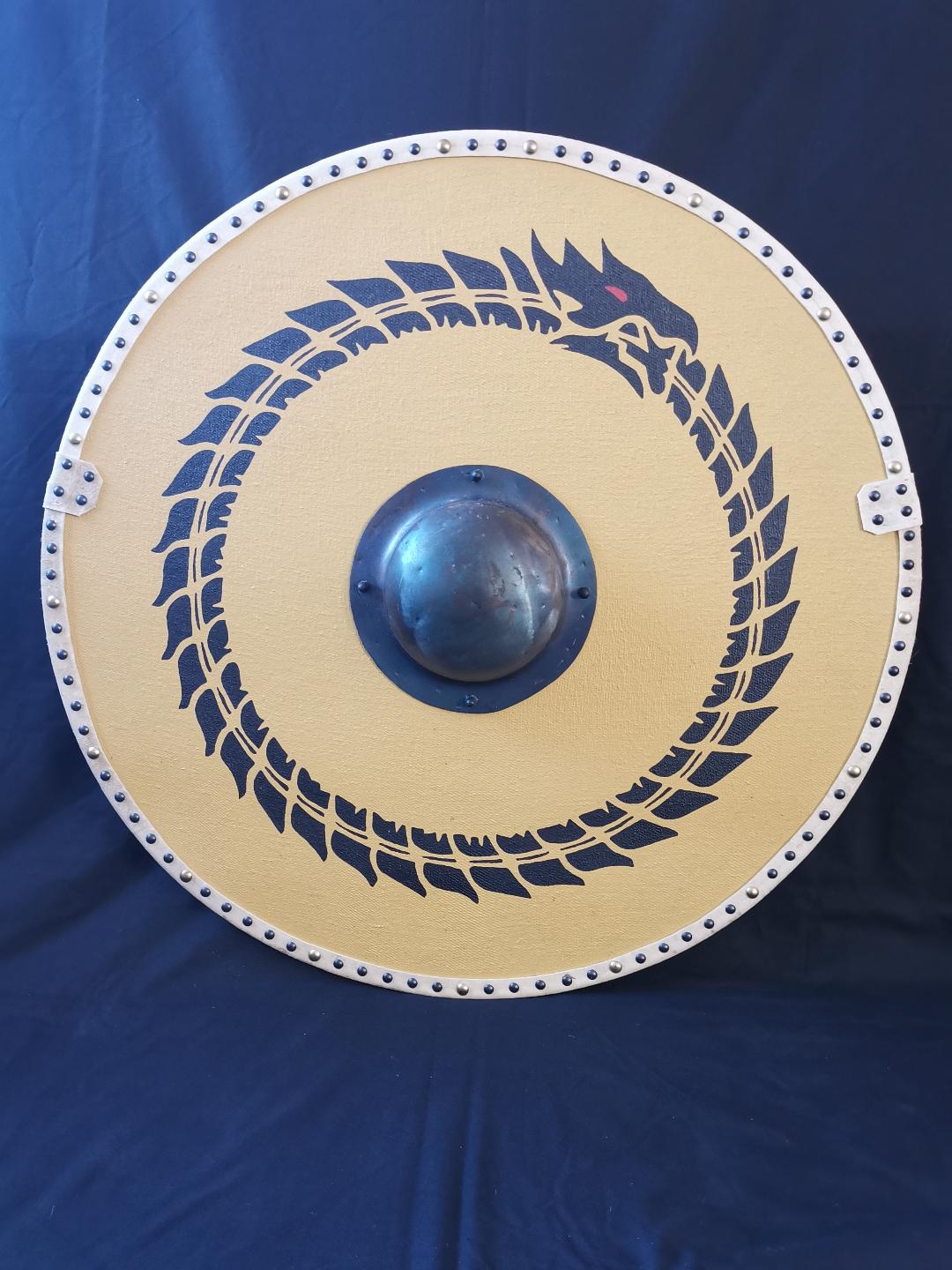 The front and rear faces of these shields are covered with linen fabric with the shield edge being wrapped and strengthened with rawhide.
